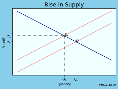 On the left, If a new technology is discovered for example, and it makes producing things easier and faster, then suppliers would produce more quantity, \(Q_1\). but since nothing has changed with the buyers, they'd have to decrease the prices to prevent an excess of stock, hence new equilibrium \(E_1\). It would initially benefit buyers more, according to this model anyway. An increase in tax would have the opposite effect (consumers would pay more for less quantity) and the supply curve would shift to the left.