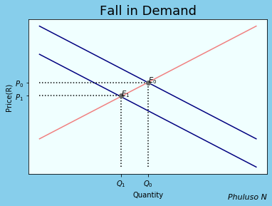 On the right, If there is an economic downturn or increase in demand for a rivalry product, the quantity demanded of a product would decline and suppliers would have to supply less which would lead to equilibrium \(E_1\). If the population increases or the economy improves however, the quantity demanded would rise and the demand curve would shift to the right .