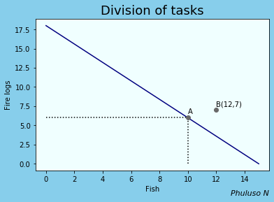 For example, suppose Martha and Henry have to collect some fire logs catch some fish. Henry can catch 12 fish and collect 8 fire logs in a day, and Martha can catch 6 fish and collect 7 fire logs in a day. This would mean Henry has an absolute advantage in both activities, while Martha has a comparative advantage in collecting fire logs. The graph of the possible combinations of things they could get done in a day would look like this, where A is one possible combination.