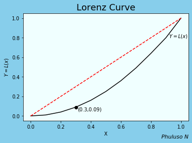The Lorenz curve is a graphical representation of income inequality, it is given by \(y=L(x)\), in range [0,1]. We rank all the households in a country by their income, then we compute % of households whose income is at most a given % of the country’s total income(i.e., poorest 30% of households receive at most 9% of the country's income)