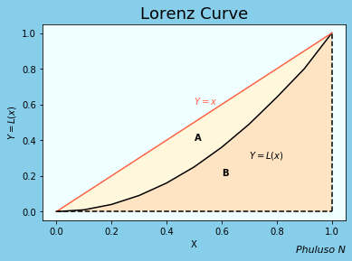The Gini index measures the income distribution among the inhabitants of a country, The Gini index is given by \(A\over {A+B}\) from the graph below, where A is the area of inequality and B is the income distribution. \(A\over {A+B}\) = \( {\int_0^1 {x-L(x)}dx}\over{1\over2} \) = \( 2\int_0^1 {x-L(x)}dx \)