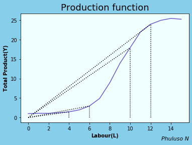 We will analyse the behaviour of the production function by first analysing the relationship between output and labour. A typical production function can look like this: