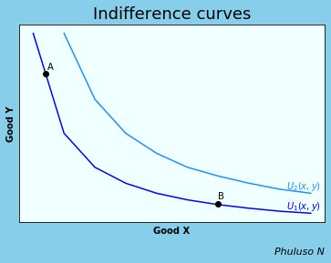 Consider the following indifference curve between good x and good y. From the graph we can see that if a person wants more of good x, they have to sacrifice good y. At A, to keep the same level of utility, you have to sacrifice a lot of good Y in order to get a little of good X. At B you have to sacrifice a lot of good Y to get a little of good X. This is because when 1 commodity is scarce to a person, they have to pay a lot more to get it. \(U_2(x,y)\) is a utility function which represents higher levels of utility for the same goods.
