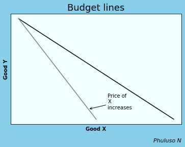 The feasible set is all points inside the curve, for more of good Y, we decrease good X. The higher good Y is, the higher the marginal product of good X, meaning the opportunity cost of X increases. If \(P_X\) increases, the slope \(P_X\over P_Y\) increases, making the curve steeper. The slope \(P_X\over P_Y\) is the marginal rate of transformation, that is, the rate at which good Y is transformed to good X and Visa Versa. If income increases budget line goes up.