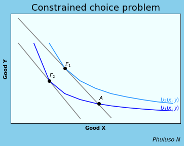 The Indifference curve we choose will be the one with the highest possible tangency, hence our Equilibrium will be at \(E_1\), where Marginal rate of transformation=Marginal rate of substitution. Point A is also a possible point, but not the most preferred since it is on a lower indifference curve. If the consumer salary were to decrease, the feasible set would shift down, and the consumer would achieve less utility, as they would have to consume less of both goods, hence the new equilibrium would change to \(E_2\)