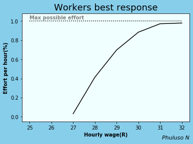 Currently in 2024, R27 is the lowest hourly wage in South Africa. This would be the reservation wage, we assume no one will do any work for anything below that. Now, the more effort a worker is putting in, the more you have to increase their wage to get more effort out of them, if their effort is low however, a little increase is enough to get more effort out them. The slope of this graph is also the marginal rate of transformation, i.e., transforming money to effort vice versa.