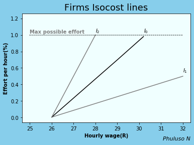 The firm's Isocost curve shows that employer is willing to pay more to get higher effort \(slope={effort\over wage}\) which is the marginal rate of substitution, it shows the amount of effort per wage the firm is willing to pay. The curve \(I_1\) means the business pays more for the same amount of effort, and \(I_2\) means they pay less for the same amount of effort. Combining the firm Isocost and the Workers best response we get: