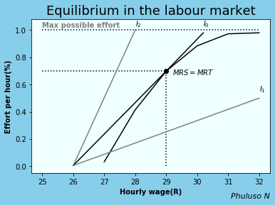 We find that the Equilibrium in the labour market is found at the tangency point where Marginal Rate of Substitution=Marginal Rate of Transformation . At this point, there is not too much pay from the employers and not too little effort from the workers.