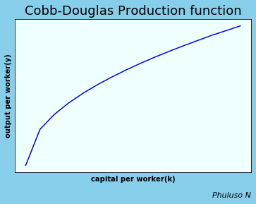 The cost function is given by \(Y=wL+rK\), like the Isocost I explained here. Hence, profit is given by \( F(K,L)-rK-wL\), in which \( {∂F\over∂L}\)=0 and \( {∂F\over∂K}\)=0, will give us: \( w={∂F\over∂L} =(1-α){Y\over L}\) and \( r={∂F\over∂K} =α{Y\over K}\) . this tells us that firms will hire labour until Marginal Product of Labour=wages paid and buy capital until Marginal Product of Capital=rent paid. hence, the share of output paid to labour is \( w{L\over Y}=(1-α)\) , and the share of output paid to capital is \( r{K\over Y}=α\) . Now suppose output per worker is \( y={Y\over L}\) and output per capital \( k={K\over L}\) . $$\therefore y={K^{α}L^{1-α}\over L}={K^{α}\over L^{α}}=k^{α} $$ With the following graph: