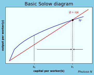 The Solow diagram consists of two curves,investment per person, sy and the amount of new investments per person required to keep the amount of capital per worker constant (n + δ)k . The steady state is where the 2 curves meet, where sy=(n + δ)k. the difference between the 2 curves is change in capital, \(\dot{k}=sy-(n + δ)k\). Suppose an economy begins \(k_0\), then the economy will grow, between \(k_0\) and \(k_1\). but the closer it gets to \(k_1\)(the steady state), the slower it will grow, then eventually stop \(k_1\). So basically the economy converges to the steady state.(that is 1 flaw of the basic solow model however, it does not explain sustained economic growth. the model has many refined variations however, which account for some of the flaws basic solow model. )