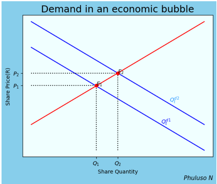 But, if there is suddenly a speculation on the asset's value increasing in the near future. The demand curve will have an equation: \(Q_{t}^{d2} =a-bP_{t}+sE_{t}\). This shows that the demand for the asset depends not only on its price \(P_{t}\), but also on the amount it is expected to increase in the near future(\(sE_{t}\)). The more the price of the asset is expected to rise (\(sE_{t}\)), the greater the quantity of the asset \((Q_{t}^{d2}\)) that people wish to purchase with the expectation of making a profitable future sale. The new market price when the demand is \(Q_{t}^{d2}\) is \(E_2\), with a greater price \(P_2\).